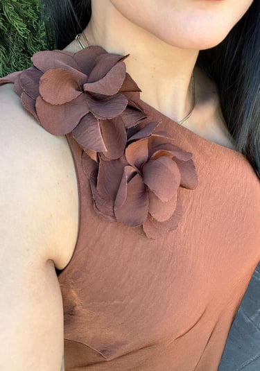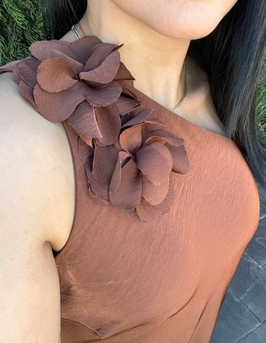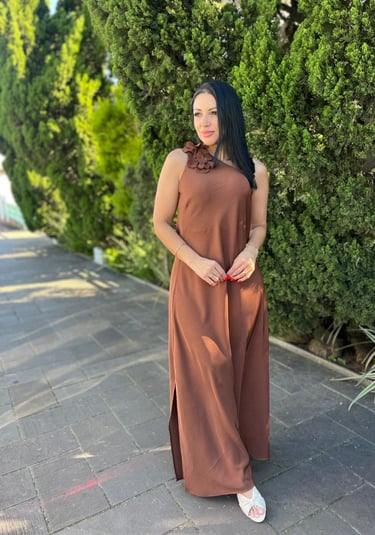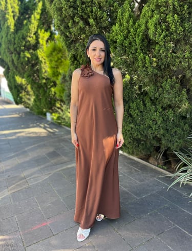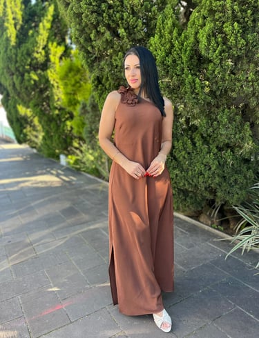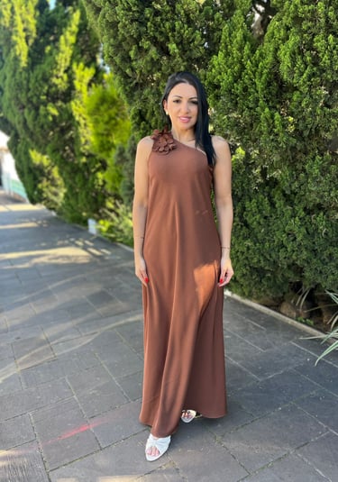 Vestido longo de um ombro só em tom marrom, com detalhe floral aplicado que adiciona charme e feminilidade. Sua modelagem fluida valoriza a silhueta com leveza, enquanto a cor sóbria transmite elegância atemporal. Uma peça marcante e versátil, perfeita para ocasiões que pedem sofisticação com naturalidade..