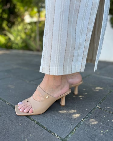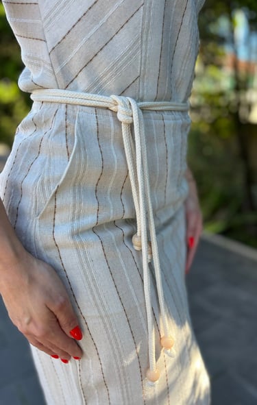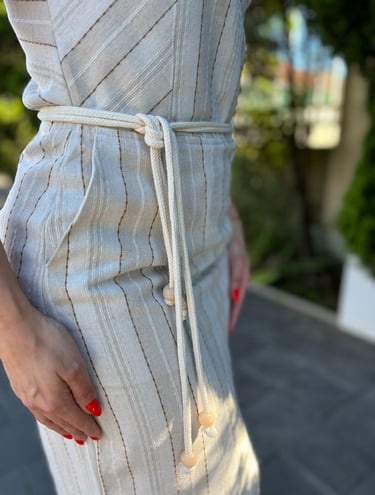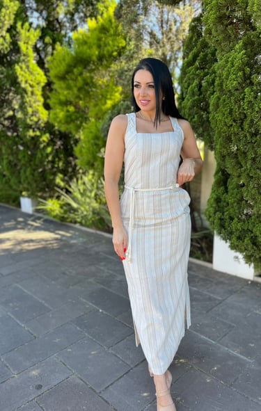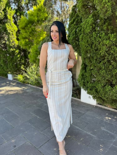 Vestido midi de alças largas com decote quadrado, em tecido listrado de tons claros que reforçam frescor e elegância. O cinto ajustável define a silhueta, enquanto as fendas laterais trazem movimento e modernidade. Uma peça versátil e charmosa, ideal para ocasiões que pedem estilo com naturalidade.