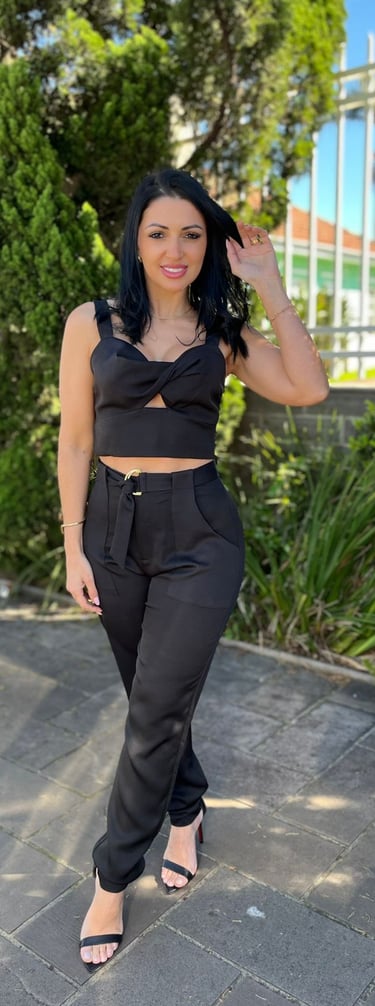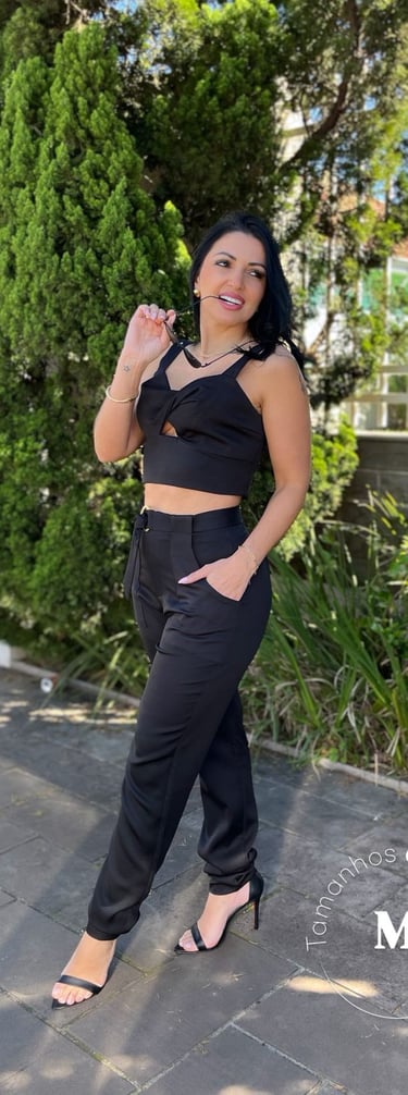 Conjunto em alfaiataria preta, composto por cropped de alças largas com recorte torcido no busto e calça de caimento reto. A silhueta é valorizada pelo equilíbrio entre ousadia e sofisticação, criando um visual moderno e impactante. Uma produção versátil e marcante, ideal para ocasiões que pedem estilo com personalidade.