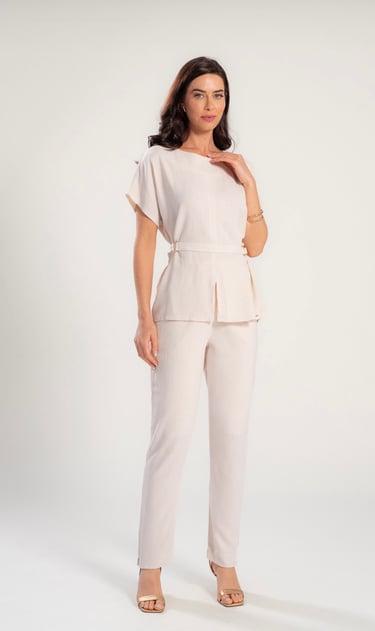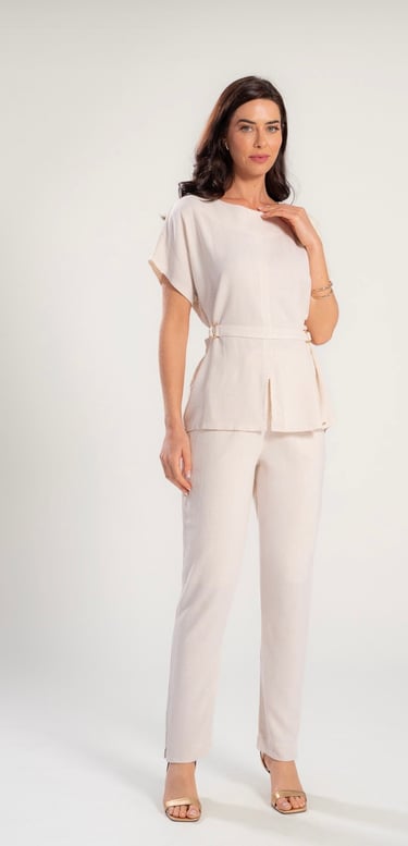 Conjunto em linho na cor natural, que transmite elegância e sofisticação na medida certa. A peça une conforto e estilo, sendo perfeita para quem valoriza looks leves, atemporais e cheios de charme, ideais para diversas ocasiões com um toque de classe discreta.
